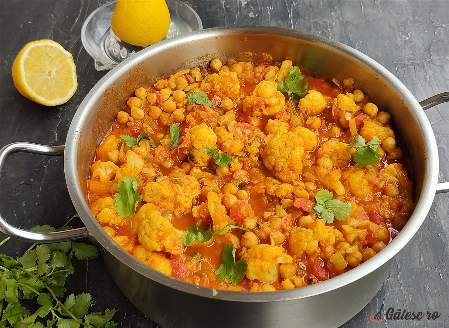 Va invit la o calatorie culinara in inima Indiei, sa descoperiti o explozie de arome intr-un preparat reconfortant, unde texturile se combina perfect. Vedetele sunt buchetelele de conopida si boabele de naut, invelite in sosul bogat dintr-o baza caramelizata de ceapa, rosii zemoase, usturoi, ardei iute si ghimbir aromat cu mirodenii si gatit cu rabdare, pana devine aproape cremos. Fiecare inghititura dezvaluie straturi succesive de savoare: chimionul aduce o nota pamantie si calda. Coriandrul ofera o prospetime subtila, usor citrica. Turmericul imbraca totul intr-o culoare aurie, vibranta. La final, preparatul este inviorat de sucul proaspat de lamaie si de aroma inconfundabila a frunzelor de coriandru. De savurat alaturi de orez basmati sau o lipie naan calda.